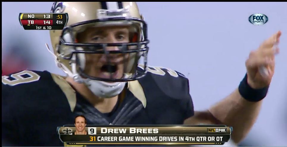 Indeed, Brees picked up his 28th game-winning drive that day. Flash forward to Sunday between the Saints and Buccaneers, and FOX had this graphic at the end of the game: