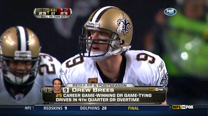 On November 13, 2011, the Saints and Falcons were playing in overtime. This was the game where Mike Smith went for it on 4th-and-1 at his own 29 and failed. This graphic from FOX came up about Drew Brees and his game-winning drives: