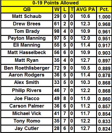 I posted some records as starters on Twitter on Friday. Matt Schaub is a perfect 29-0 when the Texans allow 0-19 points, but watch me jinx him in Baltimore on Sunday in what could be a low-scoring game between two teams who do not look that impressive so far.