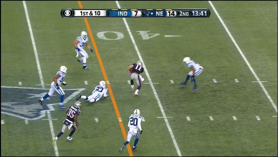 Tom Brady, for example, is 14/58 on passes thrown 21+ yards this season. Is that really something to fear? That’s in line with his previous seasons too. You can even leave a guy open and there’s a decent shot he will miss him, like he missed Amendola against the Saints this season. With the way offenses are setting records for points and yardage these days, giving up a quick strike is hardly the burden it used to be. But alas, I’m ranting again and need to get to what I saw in Saturday night’s game against Indianapolis.