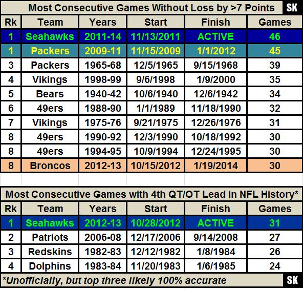 Green Bay used to be the league’s most consistently competitive team, but the Seahawks have taken that crown too. Seattle hasn’t been blown out in 52 games and now holds the record for most consecutive games without losing by more than seven points, surpassing McCarthy’s Packers. Seattle also has what I believe to be the all-time NFL record with a fourth quarter or overtime lead in 31 consecutive games (including playoffs).