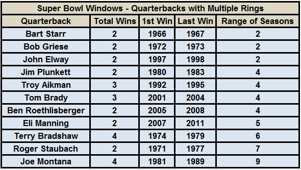 Joe Montana won his titles over the span of nine seasons. Brady is trying to get his fourth over a span of 14 years, which would easily be a record. That sounds hard, though just think of the 49ers winning five titles from 1981-1994, the same 14-year window. The only difference is the 49ers switched over to George Seifert and Steve Young, while Brady and Belichick have been the constants in New England. If you keep building good teams that compete for Super Bowls every year then it’s not that unlikely to stretch out a title window, though history favors Seattle here.