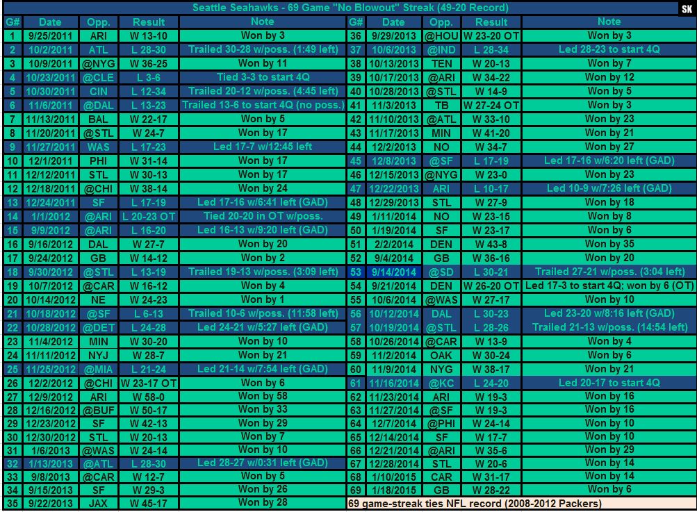 Seattle has led or been within one score in the fourth quarter in 69 consecutive games, tying the NFL record.