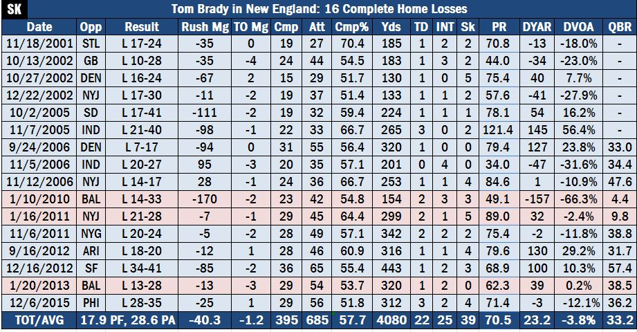 Some probably think the key to winning in New England is to outduel Tom Brady in a high-scoring game. Historically, that has not been the case. Brady has only lost 16 home games in which he played to completion since 2001. The key ingredient to a win is defense as the Patriots were held to 21 points or less in 14 of those 16 games. Brady played below average in the majority of these games.