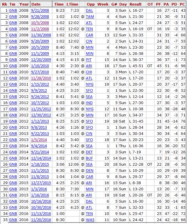 1. Glancing through the list, the Fail Mary game is included. Obviously, Aaron Rodgers is too blame for losing a game in which the Packers never trailed until a bad call on the final play of the game.