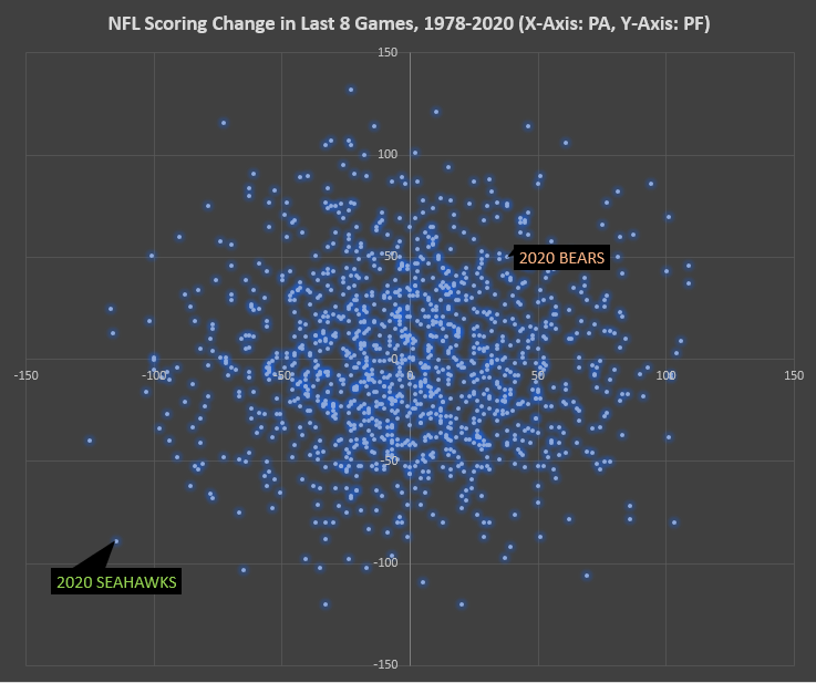 When you plot the change in scoring over the last eight games compared to the first eight for all 1,241 teams since 1978, the 2020 Seahawks really stick out. I also highlighted the 2020 Bears, who had the most positive change over the last eight games this year.