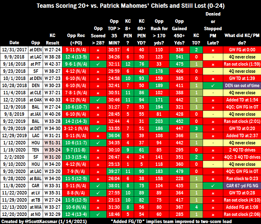 Notice in these 20 games that only the 2019 Colts, the lone winner here, were able to dominate time of possession, rush for 180 yards, recover the obligatory Chiefs fumble, close the game out in the fourth quarter, and take advantage of a huge penalty night by Kansas City.