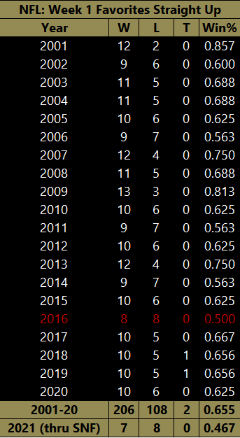From 2001 to 2020, Week 1 favorites were 206-108-2 (.655) SU. Only in 2016 did they go 8-8, so if the Raiders pull off the upset on Baltimore, we’ll see the first outright losing Week 1 for favorites in at least two decades.