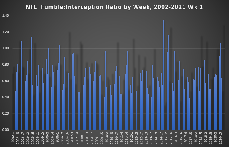 Since I’ve compiled so much data to get ready for this season, I figured I’d better start sharing it more frequently. If we look at the 172 weeks where all 32 teams were in action, this Week 1 is only the 17th week where there were more fumbles lost than interceptions thrown. Here is a chart in chronological order of the weekly fumble-to-INT ratio in the 32-team era: