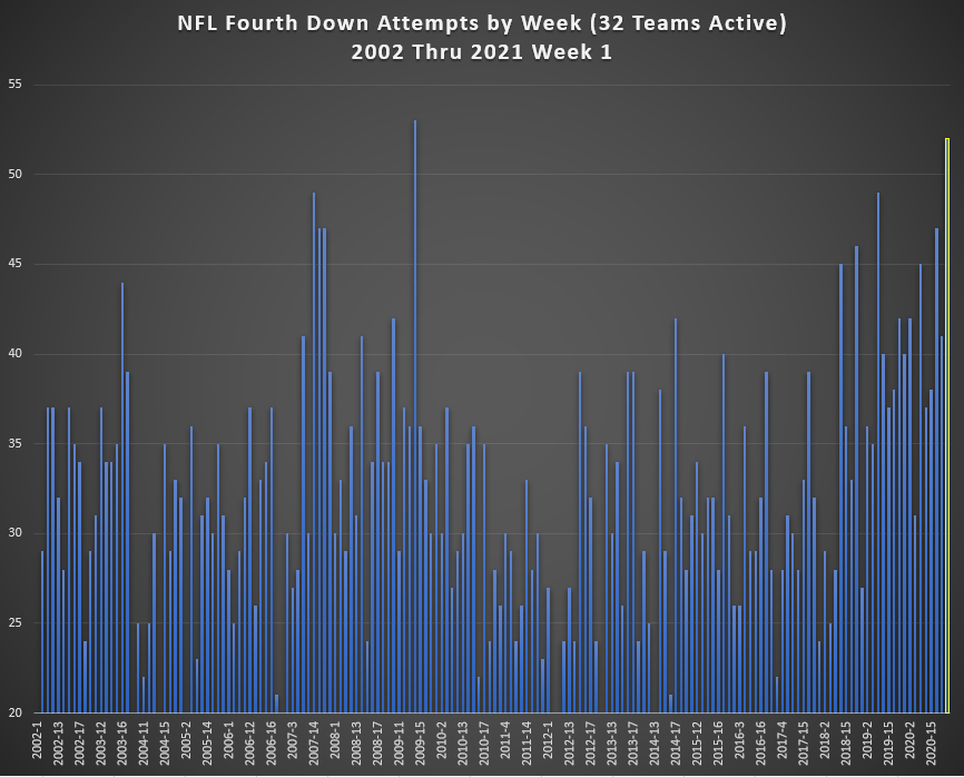In total, 11 teams tried at least three fourth downs, the most in any single NFL week since at least 2001. Overall, there were 52 fourth-down attempts in Week 1, the second-most in any week since at least 2001. Back in Week 14 of the 2009 season, there were 53 fourth down attempts, the only other week over 50 since 2001.