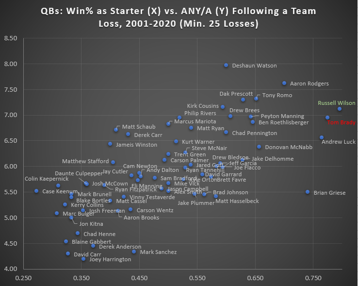 As it turns out, “Angry Bill Belichick” is likely more of a thing than Angry Tom Brady. I’ve included a chart of those 66 quarterbacks and looking at their win% vs. ANY/A after a loss. This looks very good for Russell Wilson, who again has never lost three games in a row in the same season with Seattle.