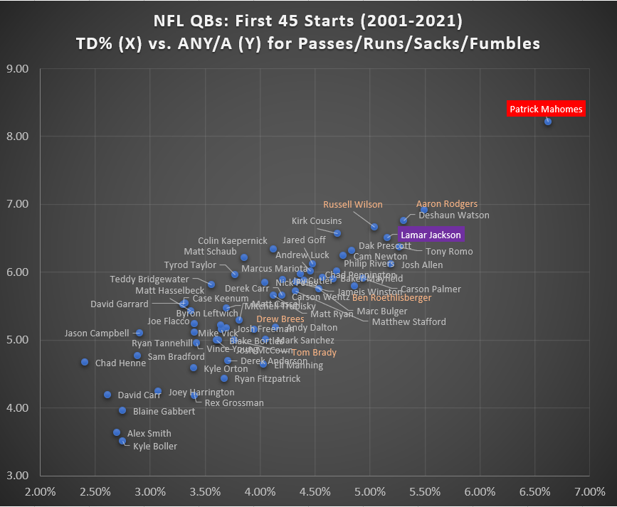 Here is a graph of all 60 quarterbacks through their first 45 starts since 2001. The x-axis is their total TD% and the y-axis is their ANY/A with all plays included.