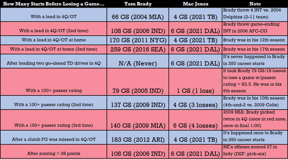 Speaking of things not ending well, Mac Jones has checked off a few more boxes after his sixth start that his predecessor rarely had to in two decades. He’s got a high-scoring loss on his resume, another lost comeback, another go-ahead touchdown drive in the fourth quarter that resulted in a loss, and he’s also done something Tom Brady never has in 350 career starts. See if you can spot it in the table I felt compelled to put together instead of updating this text every couple of weeks when the Patriots lose in ways we’re not used to seeing.