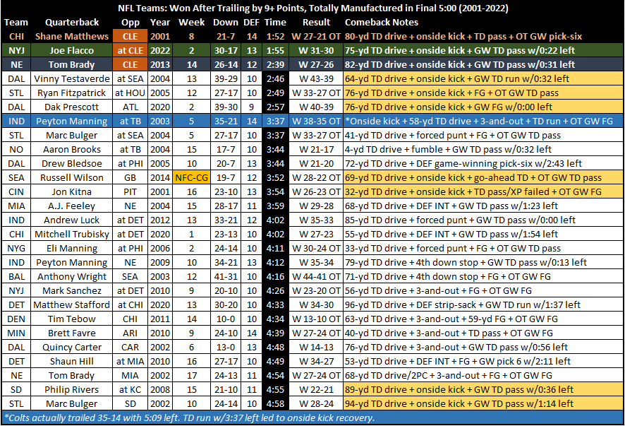 There was a 13-point comeback in Cleveland completely manufactured by the Jets (!) after the two-minute warning.