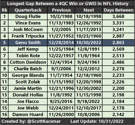 Geno Smith gets credited with his first game-winning drive since December 28, 2014. Is that a record for length in between game-winning drives? No, Doug Flutie went over 10 years before, but he also wasn’t in the NFL for most of that time. Smith’s gap is the fifth longest on record.