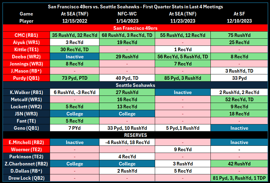 I compiled the first quarter stats for these teams last 4 meetings, including their 2022 wild card matchup. Note that this is the third year in a row the 49ers are in Seattle on TNF. This is for reference and research purposes. Make your own plays at your own risk, but I thought this guide would be useful for crafting my own plays tonight, and I wanted to share it here. If people find this useful, maybe I’ll do this more often for TNF.