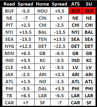 NE-CIN: It sounds like Joe Flacco is going to start again instead of Joe Burrow. Not sure I’d change my pick there because I think without Ja’Marr Chase, it’ll be hard to keep up with the Patriots when Cincy has the worst defense in the NFL.