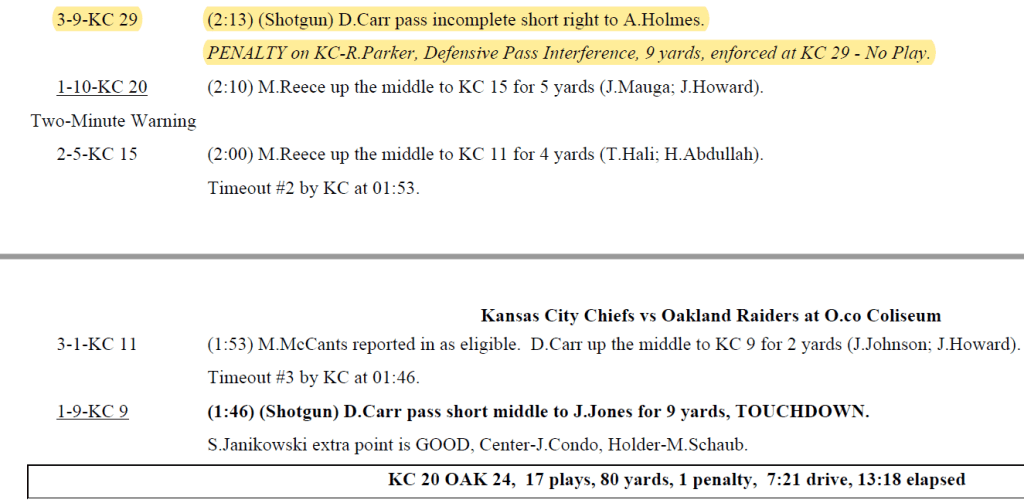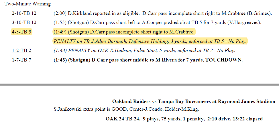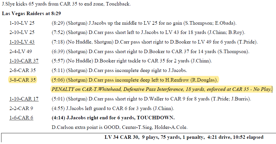 - Only needing a field goal with 2:18 left, Carr couldn’t get past his own 46, turning it over on downs to one of the worst teams in the NFL.